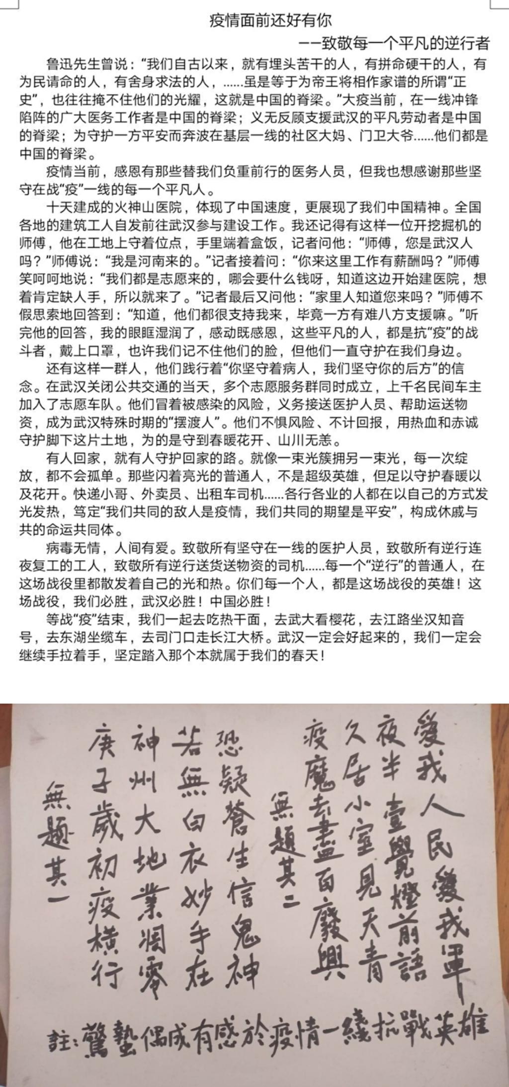 导航痕迹 欧冠官方网站 欧冠投注官网入口  学院首页  学生工作  正文 学院新闻 通知公告 科研动态 就业服务 学生工作 聚焦资源 师生风采 雷惊疫散 春暖花开——川农学子作品暖人心 2020年03月26日 中国青年网成都3月21电(通讯员 欧冠投注官网入口学生会文娱部)2019年底,一种前所未见的病毒进入了人们的视野,短短数日,新冠疫情爆发。在这个与众不同的假期,线上学习代替了面对面教学,出门玩耍的时间等价替换为在家守候的时光。为了让同学们利用闲暇时间提升自己,锻炼自己,丰富假期生活,扩宽大家对“惊蛰”“春分“的了解。欧冠投注官网入口学生会文娱部举办了“惊于疫 蛰于抑 春已至 明在前”线上活动。 活动向川农成都校区所有同学发出邀请,无论是通过展示居家之时所获技能,又或是惊蛰散霉之梨所做之食,以作品为媒,以小我见大我,给终于看到暴风雨结束前兆的人们带去一份暖心的安慰与力量。 作品《疫情之中幸好有你》《惊蛰偶成无题二首》(通讯员 活动参赛者提供) 3月5日至20日的15天中,收到林林总总28份作品。 资环17级戴林刚同学所作《惊蛰偶成无题二首》中道:“若无白衣妙手在,恐疑苍生信鬼神”。人文19级曹丽萍同学的文章《疫情面前幸好有你》里说:“等战’疫’结束,我们一起去吃热干面,去武大看樱花,去江路坐知音号,去东湖坐缆车,去司门口走长江大桥,坚定踏入那个本来就属于我们的春天!”这是所有人的盼望。当问起做此文章的灵感,曹丽萍同学表示:“每个时代都有不同的英雄,医院呼吸科ICU病房里与病毒抢时间的医护工作者就是今天的英雄,坚守在战役一线的每一个平凡人就是新时代的英雄。他们在我们看不见的角落,默默坚守,撑起万家团圆。因为有他们替我们负重前行,才有在家里安稳的学习、工作、生活的每一个人。刚好碰到活动参与,有感而发嘛。” 作品《雷惊疫散》《致敬最美逆行者》(通讯员 活动参赛者提供) 资环19级李维肖的图画《雷惊疫散》中,身着大褂的白衣勇士紧握着治愈出院患者的双手,仿佛可以听到他对患者一句句语重心长的安慰嘱托。李维肖同学说:“假期在家看新闻的时候,刚巧播报到西藏唯一一位治愈患者出院,医生门出来给他送行,他手中捧着一大束鲜花的场景让我记忆犹新。” 作诗、作文、作画,参赛者的每一个辞藻、每一句期盼、每个月一笔颜色,都是对祖国的祝福,英雄的敬意与赞美,对美好未来的期盼。 惊蛰吃梨可让虫害远离庄稼,保全年好收成。借其内涵,以“梨”为“食”也成是活动一大内容。参赛同学中有人笑说:“平日里双手用来翻书写字玩手机,终于有机会解放解放,可以拿出菜板好好露一手,做起“梨”美食咯”。这美食——有“梨”“虾”调和为一的“红酒雪梨油焖大虾”,有菠萝雪梨完美结合的“冰糖 凤梨”,有一勺下去应有尽有的“八宝梨罐”,有每个人熟悉的冰糖雪梨带点甜,有没见过的糖水带着葡萄紫,有你没见过的半梨掏空生出朵银耳枸杞。 各色各样的“梨”美食(通讯员 活动参赛者提供) 线上活动将惊蛰与春分的美好寓意融于正如火如荼的防疫之中,取惊蛰吃梨一俗和春分为春之始的含义,取古语所言“疫衰于惊蛰”,取“东作又新之始”,既结合最牵动人心的新冠现状,又无形之中将二十四节气文化宣传弘扬。吸引了成都校区10个学院共18个专业学生参与,参与年级横跨17到19级,28份作品,包含美食、诗歌、作文、视频、歌曲、书画6个大类,收到3264份对于作品的微信票选。 3月20日,“惊于疫 蛰于抑 春已至 明在前”线上活动圆满落幕。每一位活动的参与者都加深了对惊蛰、春分与防疫的认识,都收获了假期里的特殊意义。 上一条:温暖男生节,诗词现关怀——“逐梦风华,青春飞扬”男生节诗词大赛圆满结束 下一条:防疫进行时——学习维权知识,参与知识竞赛 【关闭】