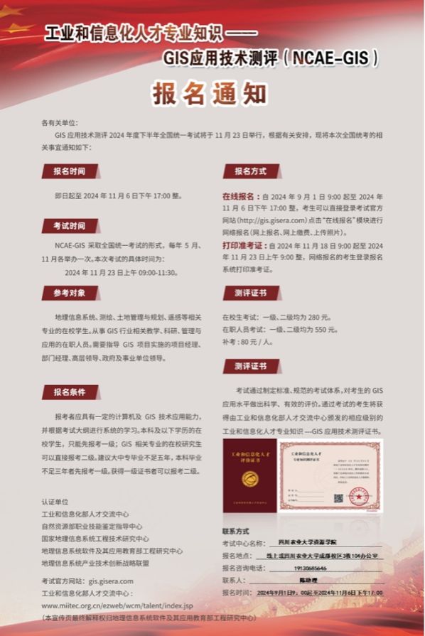 导航痕迹 欧冠官方网站 欧冠投注官网入口 学院首页 通知公告 正文 学院新闻 通知公告 科研动态 就业服务 学生工作 聚焦资源 师生风采 GIS应用技术测评 2024年09月25日 2024年9月25日 一、概述 工业和信息化人才专业知识-GIS应用技术测评是由工业和信息化部人才交流中心(原信息产业部电子人才交流中心)主办的,以信息技术和工业技术在各行业、各岗位的广泛应用为基础,面向社会,检验应试人员信息技术和工业技术应用知识与能力的测评体系。 二、整体实施目标 建立GIS人才考核标准及评价体系;建立高效、先进、及时的GIS专业技术人才知识更新体系;以GIS人才考核标准及评价体系的建立为核心,在政府有关部门指导下,与各行业广泛开展合作,建设从培训、测评、就业、到知识更新、事业提升的GIS人才系统服务工程。 三、考试等级、科目、时间 考试分为一级和二级,按其能力水平分别相当于GIS助理工程师和GIS工程师。一级考试侧重于专业基础知识的考核,不设方向;二级考试分为GIS软件开发与GIS行业应用两个方向进行考核(简称应用方向和开发方向)。 报考级别 考试时间 考试形式 一级 2024年11月23日 9:00-11:30 综合笔试 二级(应用方向) 2024年11月23日 9:00-11:30 综合笔试 三级(开发方向) 2024年11月23日 9:00-11:30 综合笔试 四、报考条件 1、凡报考者应具有一定的计算机及GIS专业知识能力,并根据考试大纲进行系统的复习; 2、本科在读及以下学历者只能先报考一级,GIS及相关专业在读硕士研究生可以直接报考二级,取得一级证书者可以报考二级。 五、报名方式 1、自2024年9月1日9:00起至2024年11月6日下午17:00整,考生可以直接登录考试官方网站(http://gis.gisera.com)点击“在线报名”模块进行网络报名(网上报名、网上缴费、上传照片),考试中心名称:欧冠投注官网入口。 2、自2024年11月18日9:00起至2024年11月23日上午9:00整,网络报名的考生登录报名系统打印准考证。 3、对于不能网上报名的考生,可以选择就近的考试中心,联系考点负责人现场报名缴费,报名时请携带身份证、学生证及电子版个人登记照片,再由考试中心统一网络报名。 现场报名地点:3-104办公室,陈助理。 QQ咨询群:1011417424。 六、收费标准 一级:550元/人,在校学生凭学生证:280元/人; 二级(应用方向):550元/人,在校学生凭学生证:280元/人; 二级(开发方向):550元/人,在校学生凭学生证:280元/人; 补考:80元/人。(考试没有通过者在一年期内有一次补考机会) 七、考试方式及注意事项 1、请考生务必参考考试大纲进行复习; 2、考试的第一部分为单选题、多选题等客观题,第二部分为名词解释、简答、论述等主观题。第一部分用答题卡(涂卡)做答,第二部分请在答题纸上做答; 3、在校学生请携带身份证和学生证参加考试,在职人员请携带身份证参加考试,以便监考老师核对身份; 4、考生务必携带2B铅笔、橡皮、蓝黑色钢笔(中性笔),不能使用涂改液,禁止携带手机,迟到不得入场; 5、考生要严格遵守考试纪律,若出现卷面雷同现象,试卷雷同者的考试成绩将被计为零分且停考一年; 6、考试采取网上报名和网上缴费的形式,考生应对提交的报考资历、学历的真实性、有效性负责。对提交虚假、无效资历、学历的,无论何时,经查属实的,将被取消考试资格,并注销已获得的水平考试证书。 7、考生咨询QQ:2235654059;考生咨询电话:027-87611193。 八、组织结构 主管单位:工业和信息化部 主办单位:工业和信息化部人才交流中心 联合认定:自然资源部职业技能鉴定指导中心 国家地理信息系统工程技术研究中心 地理信息系统产业技术创新战略联盟 承办单位:教育部地理信息系统软件及其应用工程研究中心 考核单位:工业和信息化部人才交流中心主导 教育部地理信息系统软件及其应用工程研究中心协助 培训单位:全国各地测评培训中心 咨询单位:GIS应用水平考试专家委员会 九、考试形式与考试组织 全国统一考试大纲、统一命题、统一考试、统一评分。每年统考两次,分别在五月上旬和十一月上旬。 十、证书 通过考试者,将颁发工业和信息化部人才交流中心和地理信息系统软件及其应用教育部工程研究中心联合签章的证书。该证书是用人单位聘用、晋升、定级的重要依据。 国家级证书,全国统用、终生有效、其信息将被录入全国信息化工程师人才库,供用人单位查询。其信息将录入教育部GIS工程研究中心人才库,供用人单位查询。工业和信息化部人才交流中心官方人才网、教育部GIS工程研究中心门户网站长期开展人力资源服务,并不定期举办网络招聘会。 十一、考试官方网站 1、工业和信息化部人才交流中心:www.ncie.com.cn 2、水平考试官方网站:http://gis.gisera.com 上一条:关于举办欧冠投注官网入口第四次研究生代表大会的通知 下一条:欧冠投注官网入口关于2024-2025学年度家庭经济困难学生认定结果公示 【关闭】
