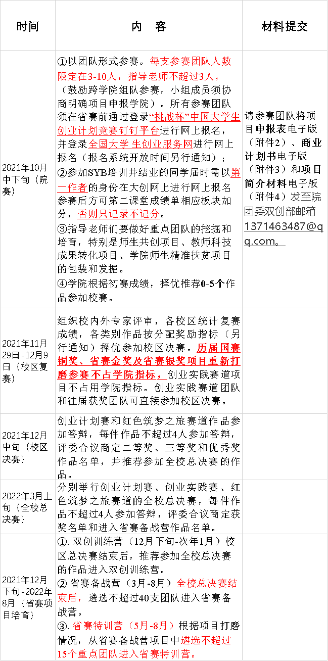 导航痕迹 欧冠官方网站 欧冠投注官网入口 学院首页 通知公告 正文 学院新闻 通知公告 科研动态 就业服务 学生工作 聚焦资源 师生风采 关于举行2022年全国大学生创业大赛校内预选赛相关事宜的通知 2021年10月10日 全院师生: 为进一步深化创新创业实践育人成效,增强大学生创新精神、创业意识和创新创业能力,提前为第十三届“挑战杯”大学生创业计划竞赛和第八届中国国际“互联网+”大学生创新创业大赛选拔、培育优秀参赛作品,现决定启动2022年全国大学生创业大赛院内预选赛,有关事宜安排如下: 一、参赛对象: 在校生(本专科生、研究生,不含在职生)以及毕业五年以内的毕业生(2017年之后毕业的本专科生、研究生,不含在职生)均可参赛。 二、参赛项目要求: 参赛项目类型、参赛项目要求、参赛赛道(详情请见附件1) 三、赛程安排: 四、奖励办法 1.所有参赛团队均可在第二课堂成绩单根据相关规定加分,获奖团队加分参照第二课堂成绩单标准另算(18、19级按旧标准执行,20、21级按新标准执行)。 2.校赛获奖团队颁发证书,国赛和省赛主赛道获奖团队参照《欧冠官方网站本专科生单项奖学金评审管理办法》颁发证书和奖金:国赛级(A级)特等奖20000元/项、一等奖(或金奖)10000元/项、二等奖(或银奖)5000元/项、三等奖(或铜奖)2000元/项;省赛级(B级)一等奖(或金奖)2000元/项、二等奖(或银奖)1000元/项、三等奖(或铜奖)500元/项。同一项目多重获奖的按最高级别标准奖励,不重复奖励。 3.教师指导学生主赛道项目获奖,参照《欧冠官方网站教职工奖励办法》《欧冠官方网站教师工作业绩评分标准》奖励。校团委对主赛道国赛获奖和省赛金奖团队指导教师单列奖金,其中国赛金奖2万元、银奖1万元、铜奖5000元、省级金奖3000元(按最高获奖级别奖励,不累加)。 4、此次学校将2022的”挑战杯“创业计划竞赛和第八届”互联网+“大赛进行了合并进项校赛;根据历届获奖情况来看,研究生的获奖机会更大,望请老师们积极动员硕士博士研究生参赛,多多挖掘师生共创项目。 五、联系方式 双创部陶洲序QQ:3143978452 双创部付雅婷QQ:1161904087 创业大赛答疑QQ群:698976369 欧冠投注官网入口 2021年10月9日 附件【附件1.docx】 附件【附件2.docx】 附件【附件3.docx】 附件【附件4.docx】 上一条:关于转发开展第四届感恩中国近现代科学家奖助学金评选工作的通知 下一条:关于推进欧冠投注官网入口2021-2022学年“青年大学习”网上主题团课学习管理办法 【关闭】