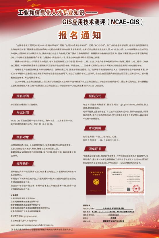 导航痕迹 欧冠官方网站 欧冠投注官网入口 学院首页 通知公告 正文 学院新闻 通知公告 科研动态 就业服务 学生工作 聚焦资源 师生风采 工业和信息化人才专业知识——GIS应用技术测评(NCAE-GIS)报名通知 2021年09月09日 考试介绍: “全国信息化工程师(NCIE)——GIS应用水平考试”简称“全国GIS应用水平考试”,代号:“NCIE-GIS”,是工业和信息化部领导、组织实施的国家IT专业政府认证体系,是我国地理信息系统(GIS)行业内国家级专业技术水平考试。 根据对GIS专业人才不同层次的需求,考试由低到高设为三个级别:即一级、二级、三级,其能力水平分别相当于GIS助理工程师、GIS工程师、GIS高级工程师。一级考试侧重于专业基础知识及基础平台应用的考核,不设方向;二、三级考试将分为GIS软件开发与GIS行业应用两个方向进行考核。 2020年5月,工业和信息化部人才交流中心将全国GIS应用水平证书改版为《工业和信息化人才专业知识测评证书》。通过考试的考生,即可获得由工业和信息化部人才交流中心颁发的工业和信息化人才专业知识——GIS应用技术测评(NCAE-GIS)证书。 报名时间: 即日起至11月1日17:00整结束。 报名方式: 考生可以选择网络报名,报名官网为:gis.gisera.com(填报信息、上传照片、网上缴费、打印准考证)。 对于不能网上报名的考生,可以选择就近的考试中心,联系考点负责人现场报名缴费,报名时请携带身份证、学生证及电子版彩色个人登记照片,再由考试中心统一网络报名。 考试时间: NCAE-GIS采取全国统一考试的形式。 每年全国统一考试两次,上半年考试时间在5月份,下半年考试时间在11月份。 本次考试的具体时间为:2021年11月20日。 考试费用: 在校生考试:一级、二级均为280元。 在职人员考试:一级、二级均为550元。 参考对象: 希望巩固理论基础、丰富实践经验、获得权威认可、增强就业实力的在校学生。 希望从事或者即将从事GIS行业相关工作的人员。非GIS相关专业毕业,但正在从事GIS相关工作并希望提高职业素质的在职技术人员。 希望提高考试促进知识更新、拓宽晋升空间的GIS专业技术人员。 需要指导GIS项目实施的项目经理、部门经理、高层领导、政府及事业单位领导。 报考条件: 报考者应具有一定的计算机及GIS技术应用能力,并根据考试大纲进行系统的学习。 本科及以下学历的在校学生,只能先报考一级;GIS相关专业的在校研究生可以直接报考二级。 建议大中专毕业不足五年,本科毕业不足三年者先报考一级。获得一级证书者可以报考二级。 颁奖证书: 考试通过制定标准、规范的考试体系,对考生的GIS应用水平做出科学、有效的评价。通过考试的考生将获得由工业和信息化部人才交流中心颁发的相应级别的工业和信息化人才专业知识——GIS应用技术测评证书。该证书可以在工业和信息化部人才交流中心官方网站上查询。查询网址:gis.gisera.com。 联系方式: 考试中心名称:欧冠投注官网入口 报名地点:线上报名官网:gis.gisera.com;线下报名:欧冠官方网站3教102办公室 报名咨询电话:18200288277 联系人:王助理 报名时间:即日起至2021年11月1日 附件:报名通知 上一条:欧冠投注官网入口关于开展2021年秋季学期入党积极分子培训的通知 下一条:欧冠投注官网入口关于开展“请党放心,强国有我”主题团日活动的通知 【关闭】