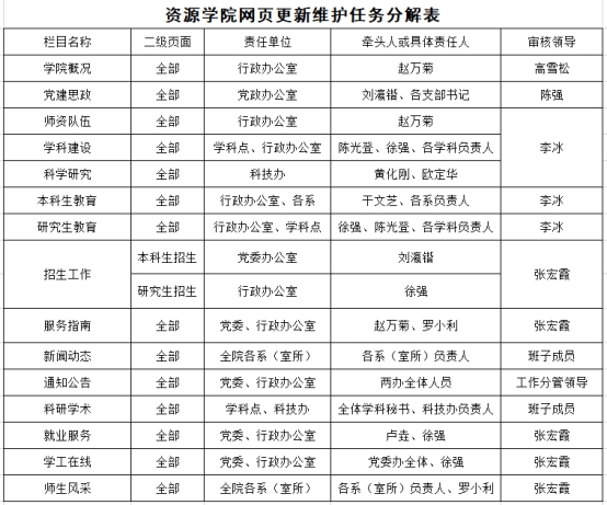 导航痕迹 欧冠官方网站 欧冠投注官网入口 学院首页 通知公告 正文 学院新闻 通知公告 科研动态 就业服务 学生工作 聚焦资源 师生风采 学院关于宣传工作目标管理责任及任务分工的通知 2022年05月13日 各系(室、所)、各学科: 为进一步加强学院宣传工作,强化宣传效果,扩大学院影响力,结合学院宣传工作管理办法,现将宣传工作目标管理责任及任务分工通知如下,请遵照执行。 一、新闻及通讯宣传 1.各系(室、所)每学期至少撰写并在学院及以上相关媒体发布新闻、通讯等宣传稿件6篇,其中校网或外宣稿件不少于2篇,鼓励外媒转发宣传。 2. 各系(室、所)每学期至少提供师生的优秀事迹宣传稿件不少于2篇。(该项对学院科技办公室不作硬性要求) 二、学院网页更新及维护 1. 网页更新维护实行管理责任制,每个栏目落实责任单位和牵头责任人(见下表),对所管理栏目的更新和维护负责,定期或不定期查阅栏目,避免内容有误、更新不及时或出现网络安全及舆论隐患。 2. 学院网页内容中属日常性更新的栏目需要进行实时更新,更新频率不得低于每周1次;属于非日常性更新的栏目原则上每学期要进行1-2次内容或数据的更新,并明确标注出更新截止期限。 3.更新的内容需经《欧冠投注官网入口网页更新维护任务分解表》中审核领导审核后发学院宣传管理员罗小利进行更新上传(党委和行政办公室根据权限自行上传);发现安全隐患等问题时也需及时报学院宣传 管理员。 特此通知 欧冠投注官网入口党委 2022年5月13日 上一条:关于公布2022年春季科研兴趣培养计划结题项目的通知 下一条:关于进一步落实学院本科生疫情防控网格管理制度的通知 【关闭】